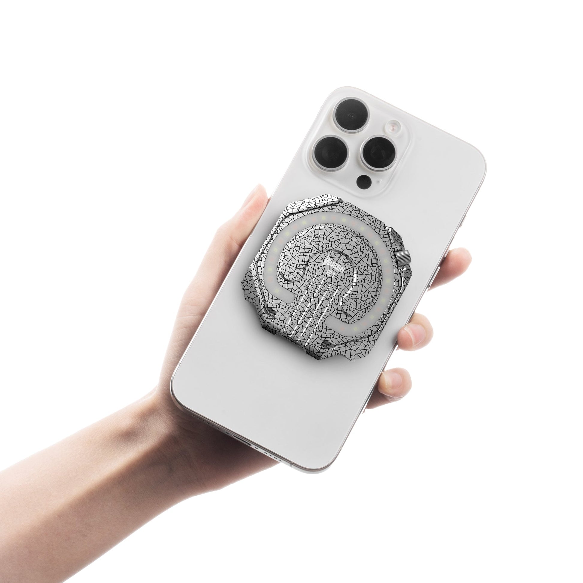 マグネット式スマートフォンホルダー:MagSafe対応設計に最高級のN54マグネットを採用することで、デバイスの確実な固定と長寿命化を実現しました。スマートフォンに取り付けて補助光として使えるだけでなく、角度調整可能なスマートフォンスタンドとしても使用できます。取り付け・取り外しも簡単で、鉄板などにもしっかりと固定できます。